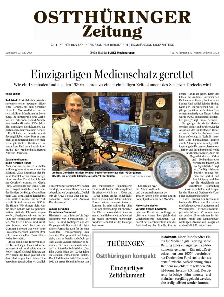 Quelle: Ostthüringer Zeitung vom 22.03.25; Text: OTZ-Redakteurin Heike Enzian / Studio-Foto: Iris Tomoschat / Foto Filmdose: Christel Schwarz